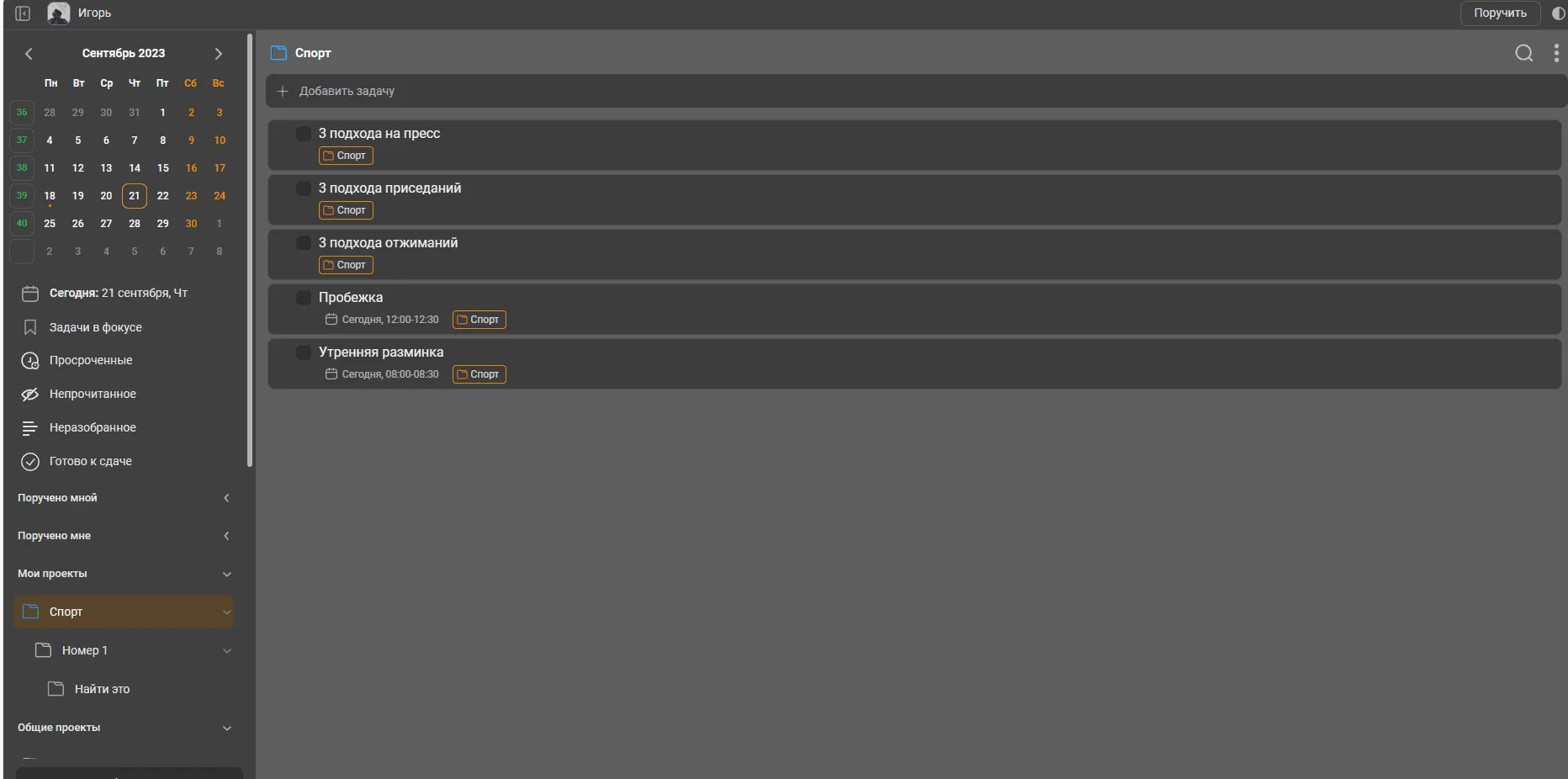 Для спорта заведите отдельные задачи на кардио, силовые тренировки, йогу. Ставьте конкретные цели по дням и видам нагрузки.