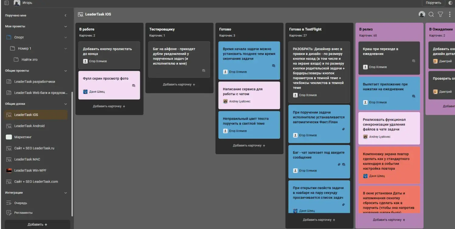 Помимо точечных поручений задач, ЛидерТаск также поможет вам и в командной работе. Создавайте общие проекты и доски. В них вы сможете работать по методике скрам, обсуждать и распределять поставленные задачи.