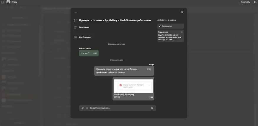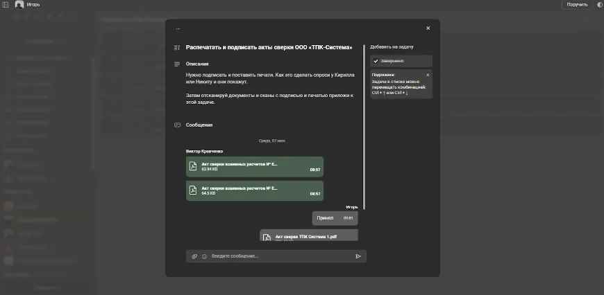 При помощи чата в задаче вы сможете взаимодействовать и обсуждать задачу вашего сотрудника. На первых этапах задачи вы сможете сразу определить все важные вопросы по выполнению, сроки и дедлайны. Вы можете прикрепить файлы в чате, чтобы сотрудник более четко понимал задачу. Или же наоборот, сотрудник может прикрепить файл к задаче, предлагая альтернативные варианты достижения поставленной цели.