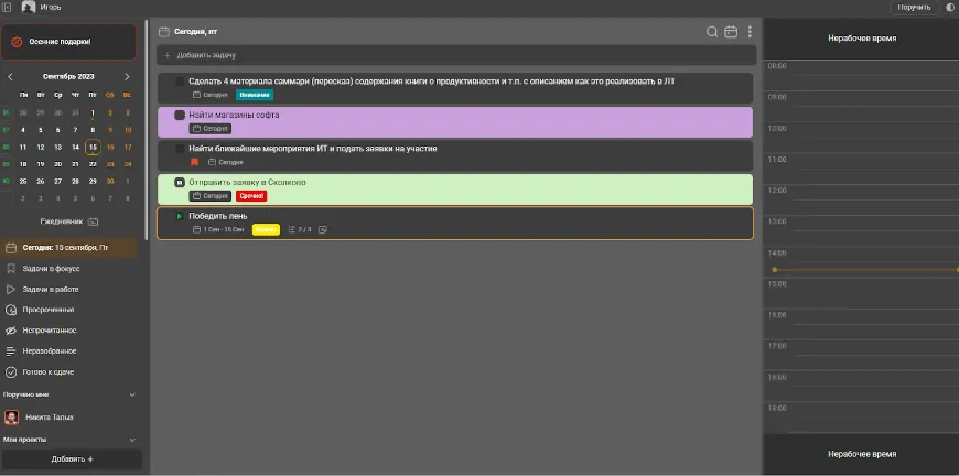Периодически у вас может скопиться множество задач и чтобы легче ориентироваться в них, используйте цвета и метки. Допустим, цвета могут обозначать степень выполнения задачи, а метки позволят вам отметить наиболее важные и срочные задачи. Также используйте специальную пометку “ фокусе”, чтобы обозначить задачи, на которых сейчас нужно сделать акцент(они появятся у вас в отдельном разделе навигатора “задачи в фокусе”.