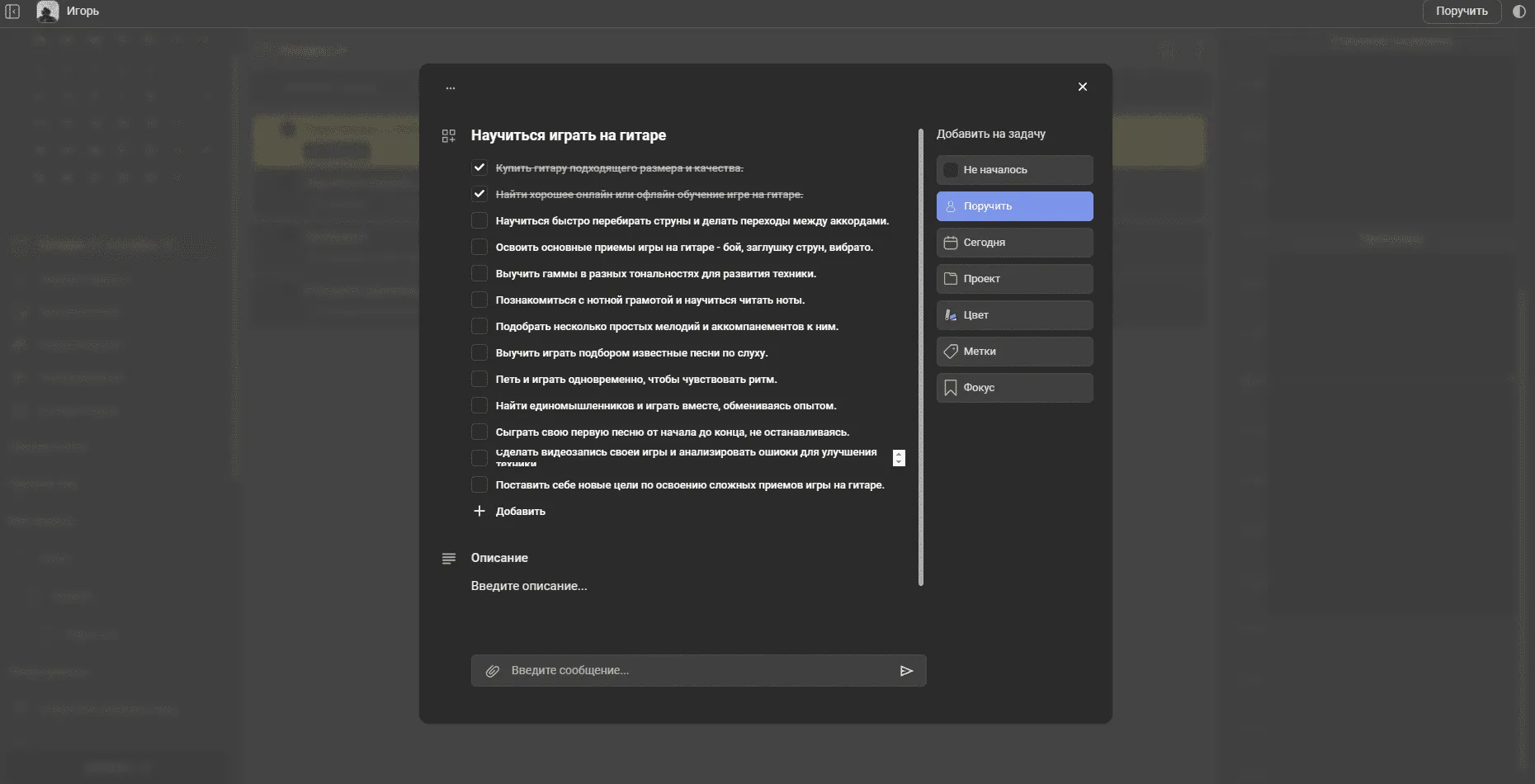 Используйте ЛидерТаск для постановки целей, создайте задачу на определённый срок, например на неделю или месяц. Планируйте конкретные шаги к их достижению с чек листами. процессе выполнения задачи чек листы помогут проследить вам за её прогрессом. Допустим,, вы хотите поставить себе цель на месяц “научиться играть на гитаре”.