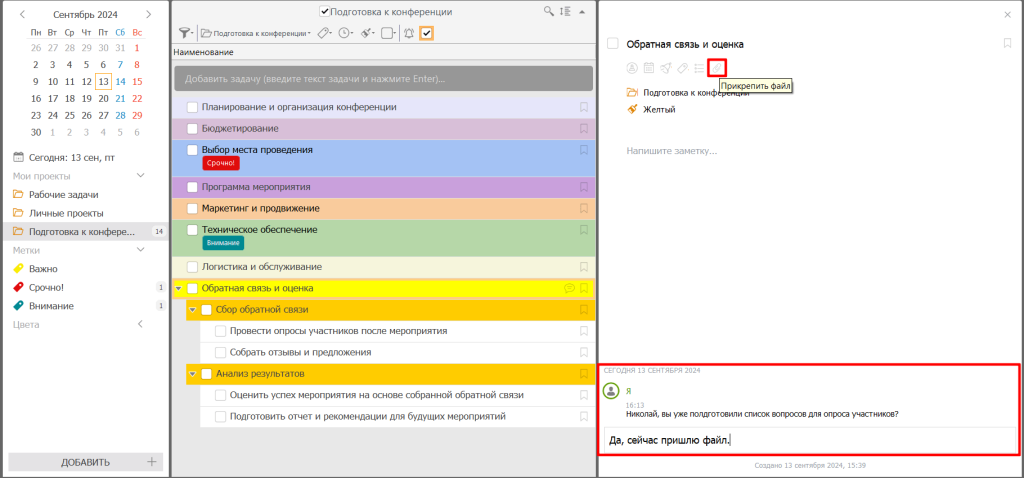 - Общайтесь с командой в чате задач, обменивайтесь файлами и ссылками. Это поможет не упустить ни одной детали при работе над проектом.