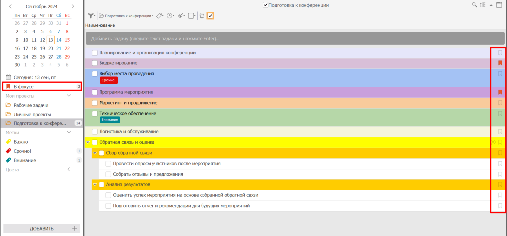 Фокус-режим. Чтобы помочь сосредоточиться, когда это действительно необходимо, приложение предлагает режим фокуса, который минимизирует отвлекающие факторы и позволяет полностью погрузиться в работу. Этот режим особенно полезен в моменты, когда требуется сосредоточенность на одной задаче.