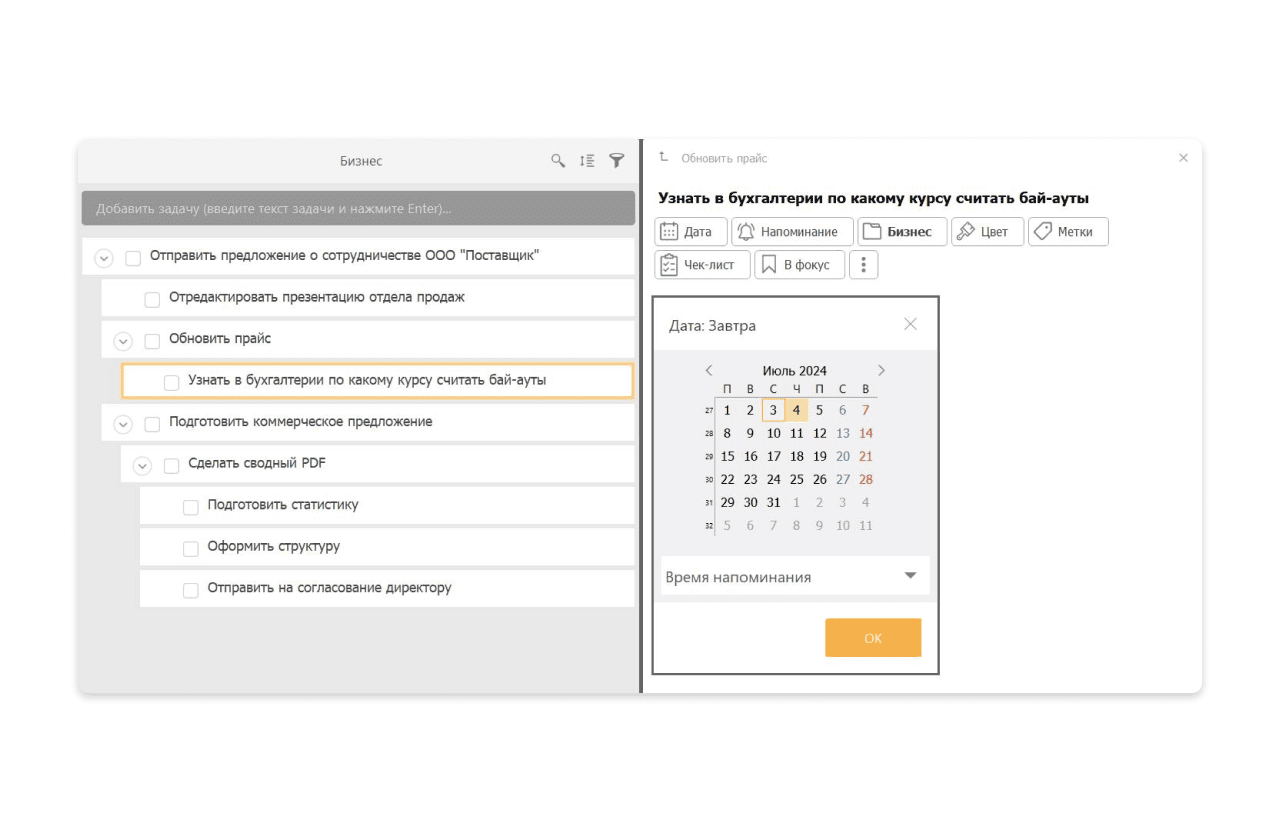 В ЛидерТаске можно легко разделить большую задачу на этапы. Достаточно добавить к ней подзадачи. Любую из них можно выделить цветом, назначить метку, установить срок и поставить напоминание.