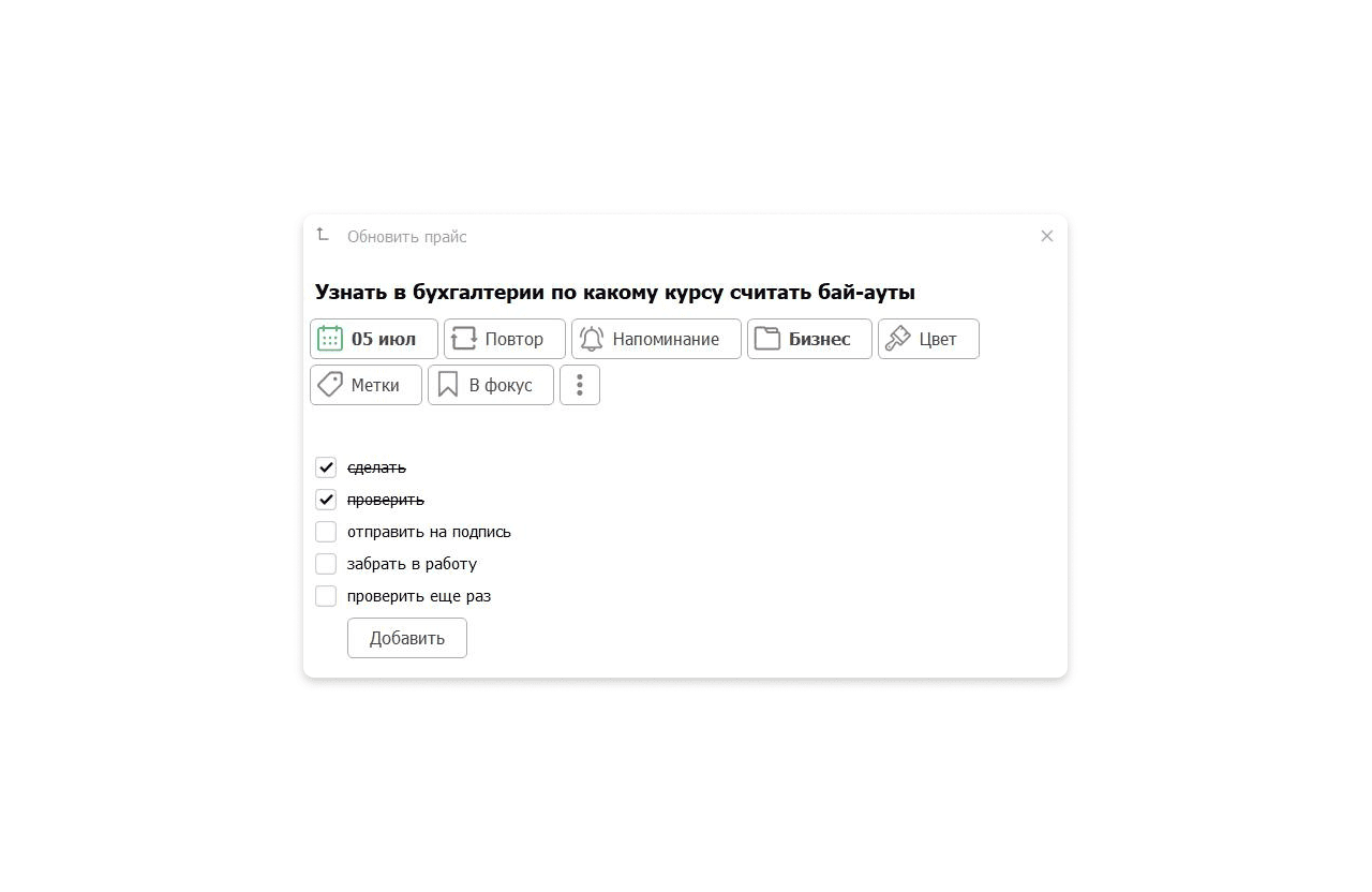 В ЛидерТаске в любой задаче можно создать чек-лист с пунктами, которые нужно сделать. Этот удобный инструмент визуализации выполненных и предстоящих действий помогает держать фокус на задаче, а не забивать голову мелкими делами.