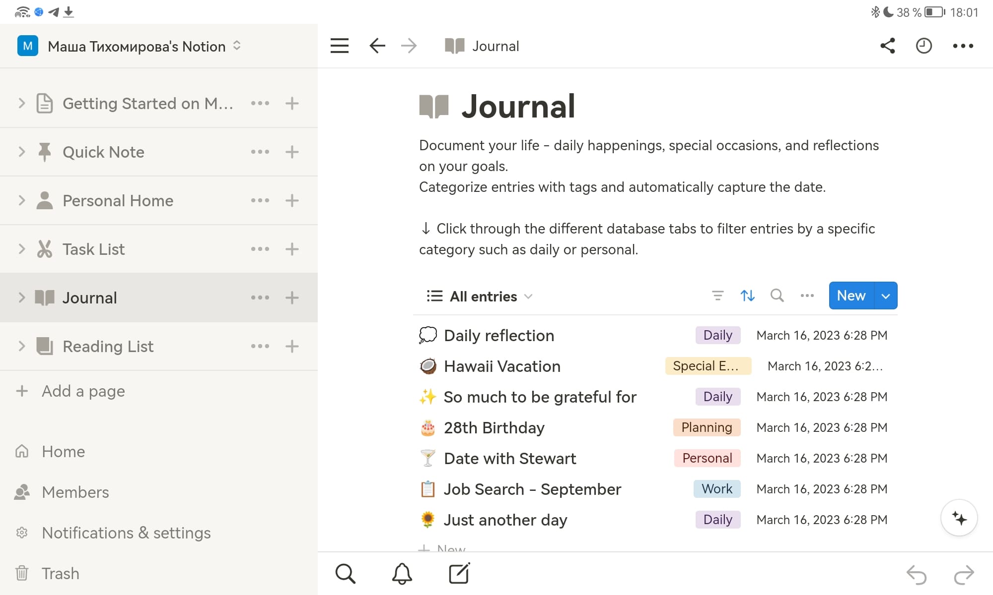 Личная. Предназначена для личного пользования конкретного человека. В ней можно собирать идеи, планы, заметки. Такая база данных — это что-то типа виртуального блокнота, где все разрозненные мысли, которые приходят в голову в течения дня, структурированы и распределены по категориям.