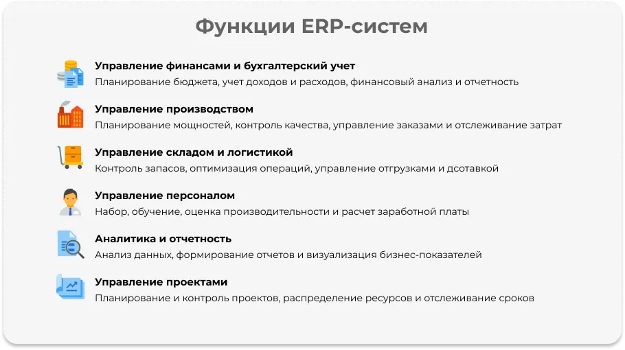 ERP-системы повышают эффективность бизнеса, автоматизируя и улучшая рабочие процессы в разных областях: финансы, производство, склад и управление персоналом. Их цель — обеспечить слаженную и продуктивную работу отделов компании.