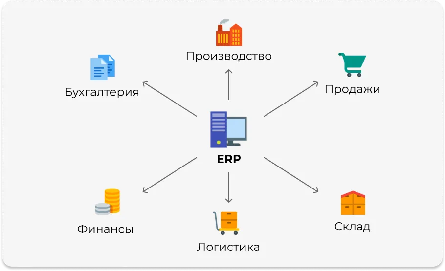 **Интеграция бизнес-процессов в единую систему. **Создает базу данных для компании, охватывая все, от учета до производства и логистики. Обеспечивает доступ к необходимой информации для каждого отдела. Благодаря этому, информация не дублируется, а вероятность ошибок снижается, поскольку все работают с одними и теми же данными.