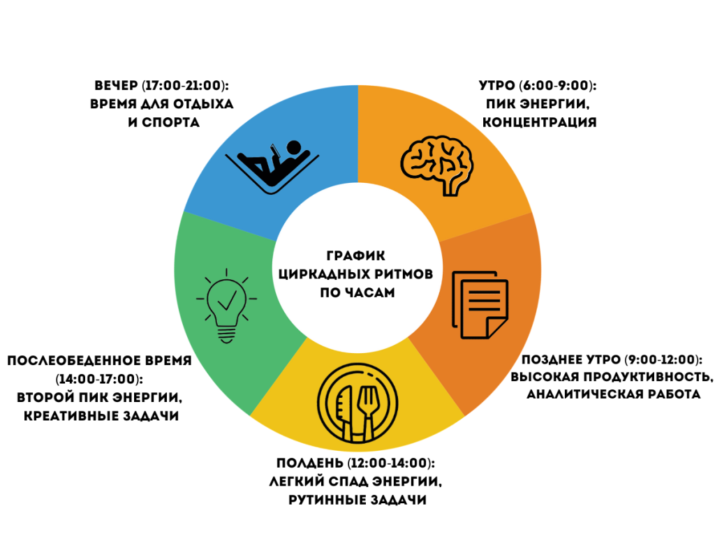 Циркадные ритмы определяют, когда организм наиболее готов к различным видам деятельности. Вот примерный график: