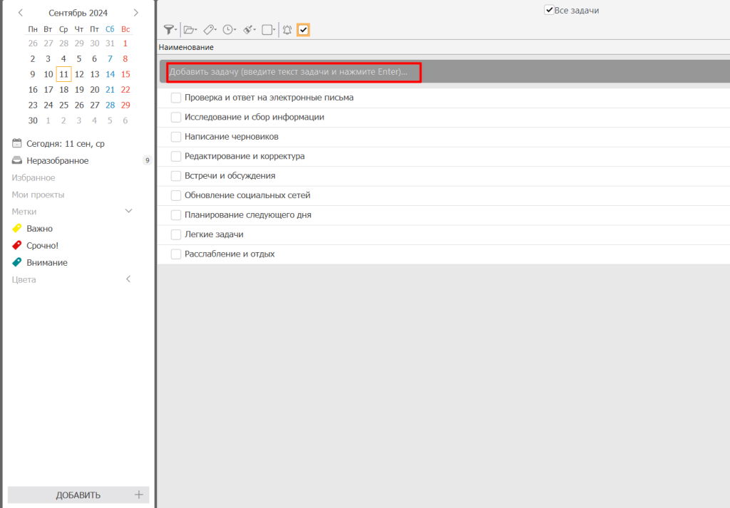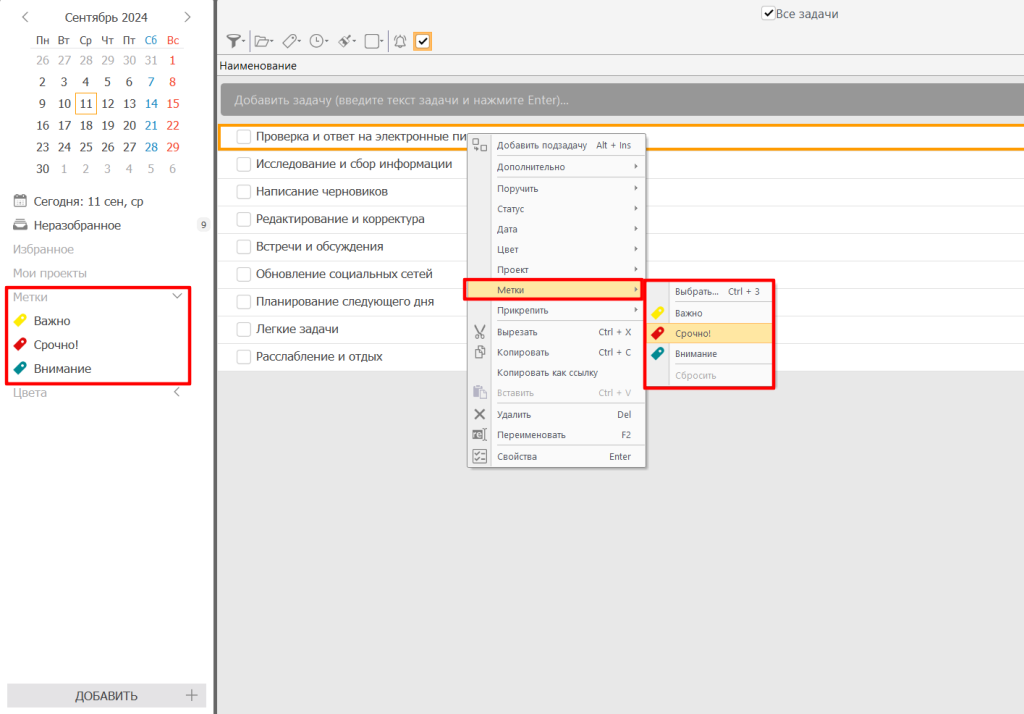- Используйте маркеры приоритетов и группировки дел. Например, задания с высоким приоритетом помечайте как «Срочно», чтобы быстро находить их в соответствующей папке и выполнять в часы максимальной продуктивности.