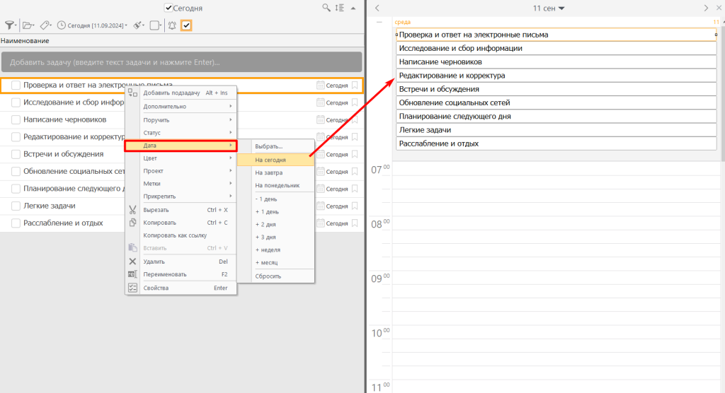 - Выберете дату выполнения дел, чтобы они отобразились в ежедневнике.