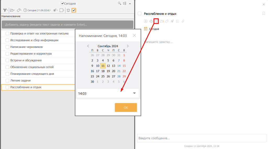 - Для перерывов и отдыха также создайте отдельные задачи и настройте напоминания.