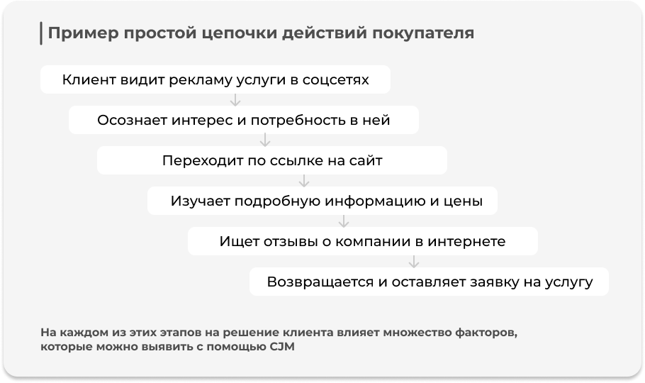 Такие остановки принято называть точками касания, в каждой из которых клиент получает опыт взаимодействия с бизнесом. CJM показывает полную историю такого взаимодействия: