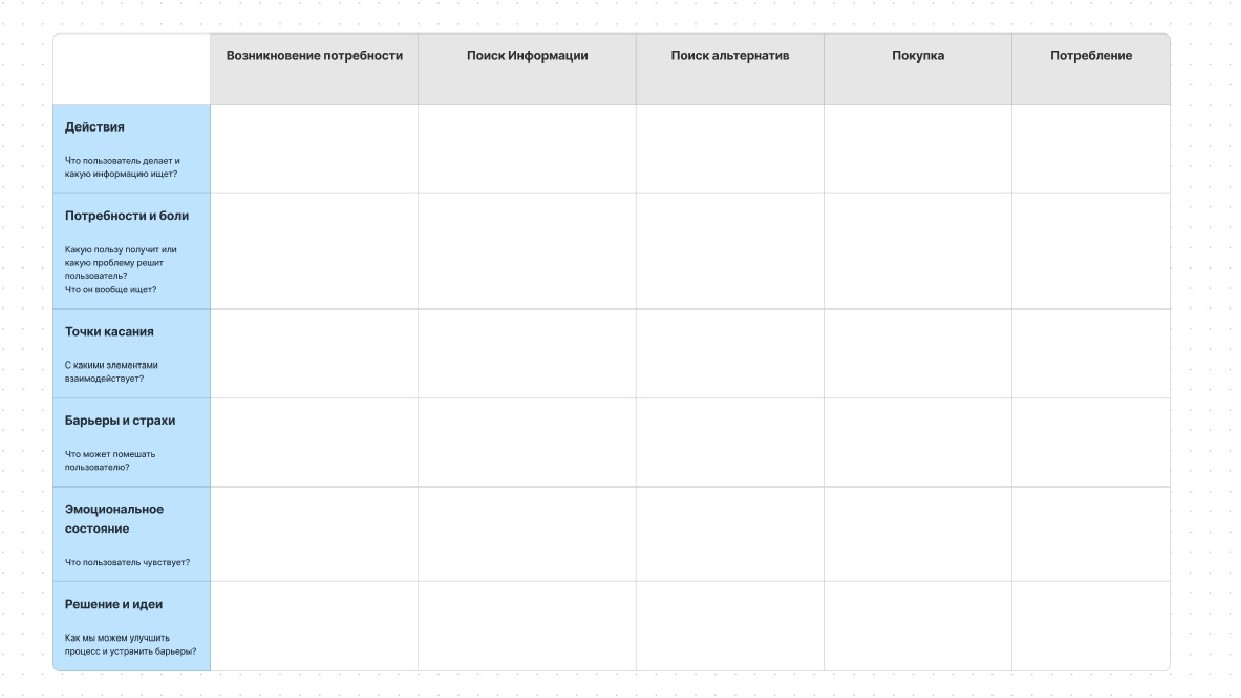 Для начала сделаем таблицу-каркас, по которой потом распределим информацию. В верхней части таблицы пропишем этапы на пути к покупке, а слева – все виды данных, которые важно отследить.