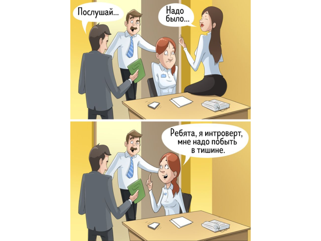 Одна из них — адаптация к социальным и профессиональным условиям, где от человека часто ожидается активное участие в групповых обсуждениях или постоянное общение. Интровертам сложно вовремя вставить свою точку зрения в шумной обстановке, что иногда создает ложное впечатление о неуверенности или осведомленности.