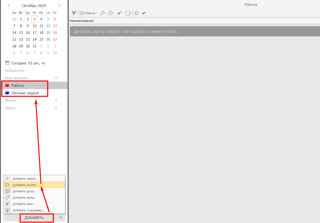 - Создайте проекты для разных сфер жизни. Нажмите «Добавить проект» и дайте им название, отражающее суть, например, «Работа», «Личные задачи».