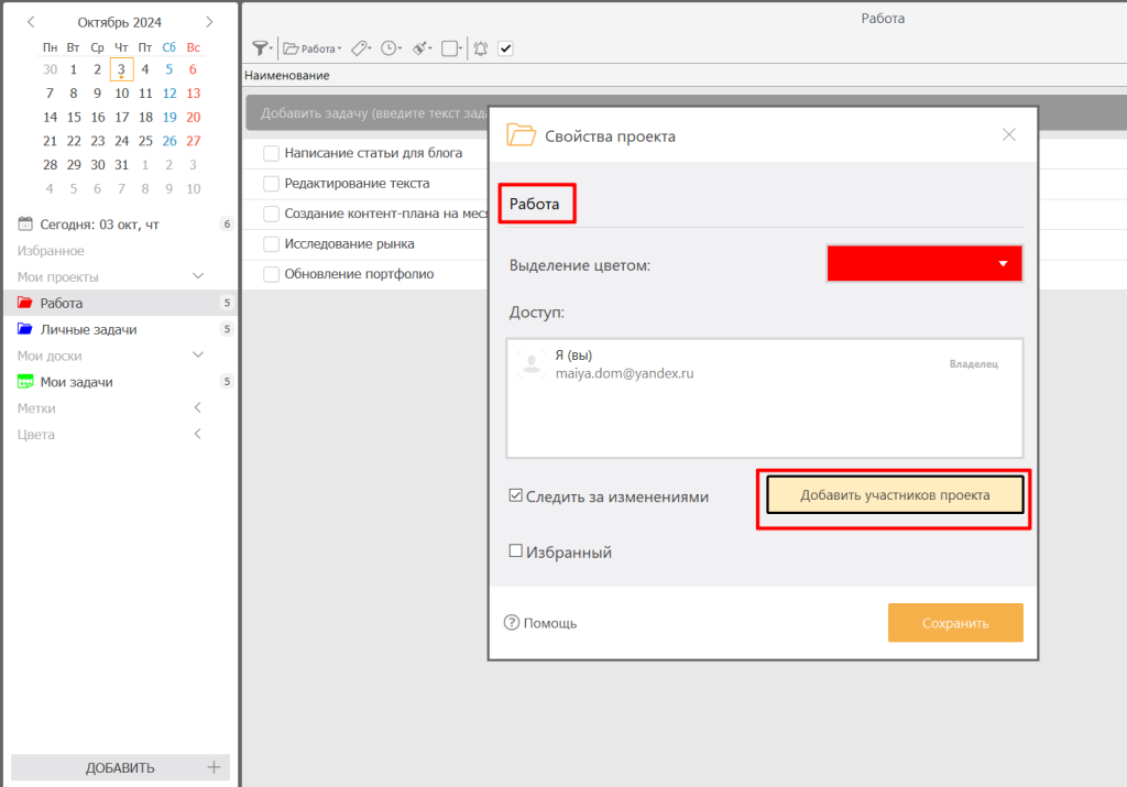 - Если вы работаете в команде, добавьте коллег в проект через «Свойства».