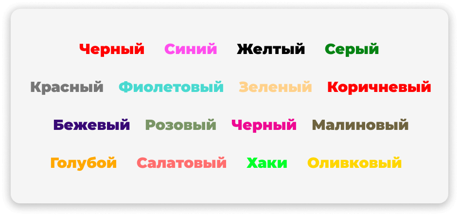 Упражнение может показаться простым, но это не так. Видя текстовую информацию, мы привыкли моментально считывать её. Здесь же текст и цвет противоречат друг другу, и чтобы выполнить упражнение правильно, понадобится усилить внимание.