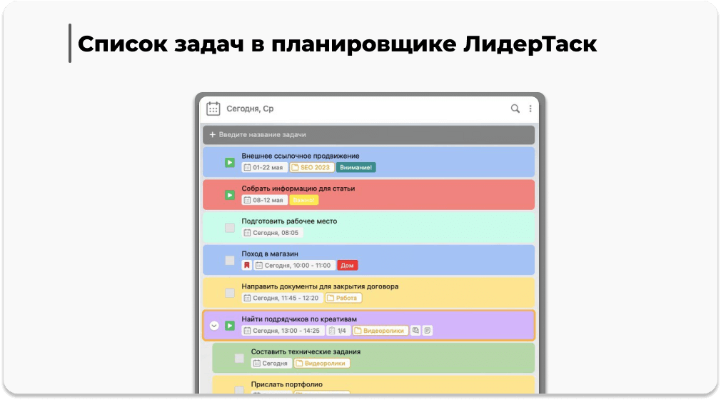 Для планирования попробуйте цифровые инструменты, например, планировщик ЛидерТаск. Он позволяет не только записывать задачи, но и наглядно отображать их в виде проектов, списков, разделять задачи с помощью меток. Это упрощает процесс организации, отслеживания прогресса. В приложении присутствуют функции напоминаний и повтора для каждой задачи, благодаря которым можно настроить регулярные задачи и уведомления.
