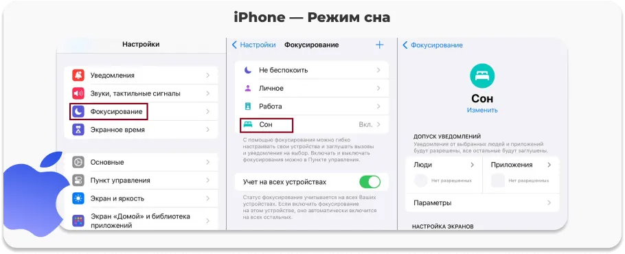 Отключайте уведомления на телефоне за 2 часа до сна. Для этого на айфоне можно включить режим сна, а на андроиде — режим «Не беспокоить».
