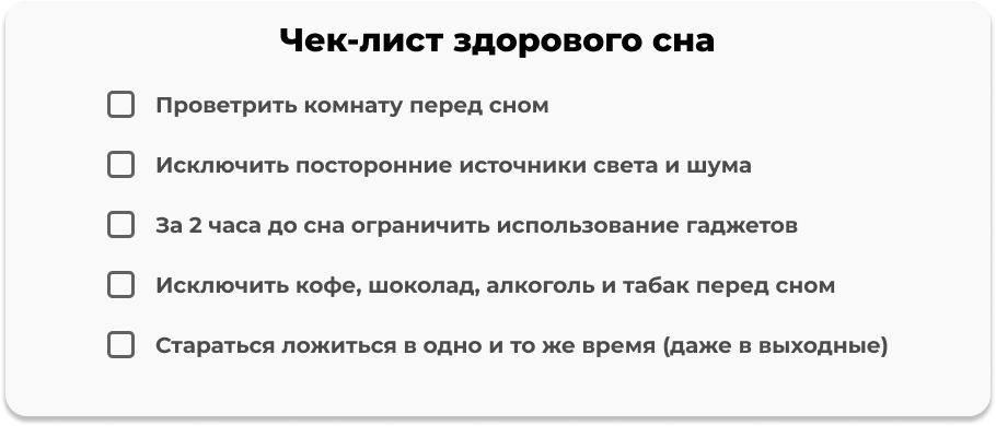 Мозг не переносит недостатка сна. Когда вы спите, он очищается от токсинов и вырабатывает мелатонин. Этот гормон регулирует активность нервной системы. Подготовиться к качественному сну и ничего не забыть поможет чек-лист.