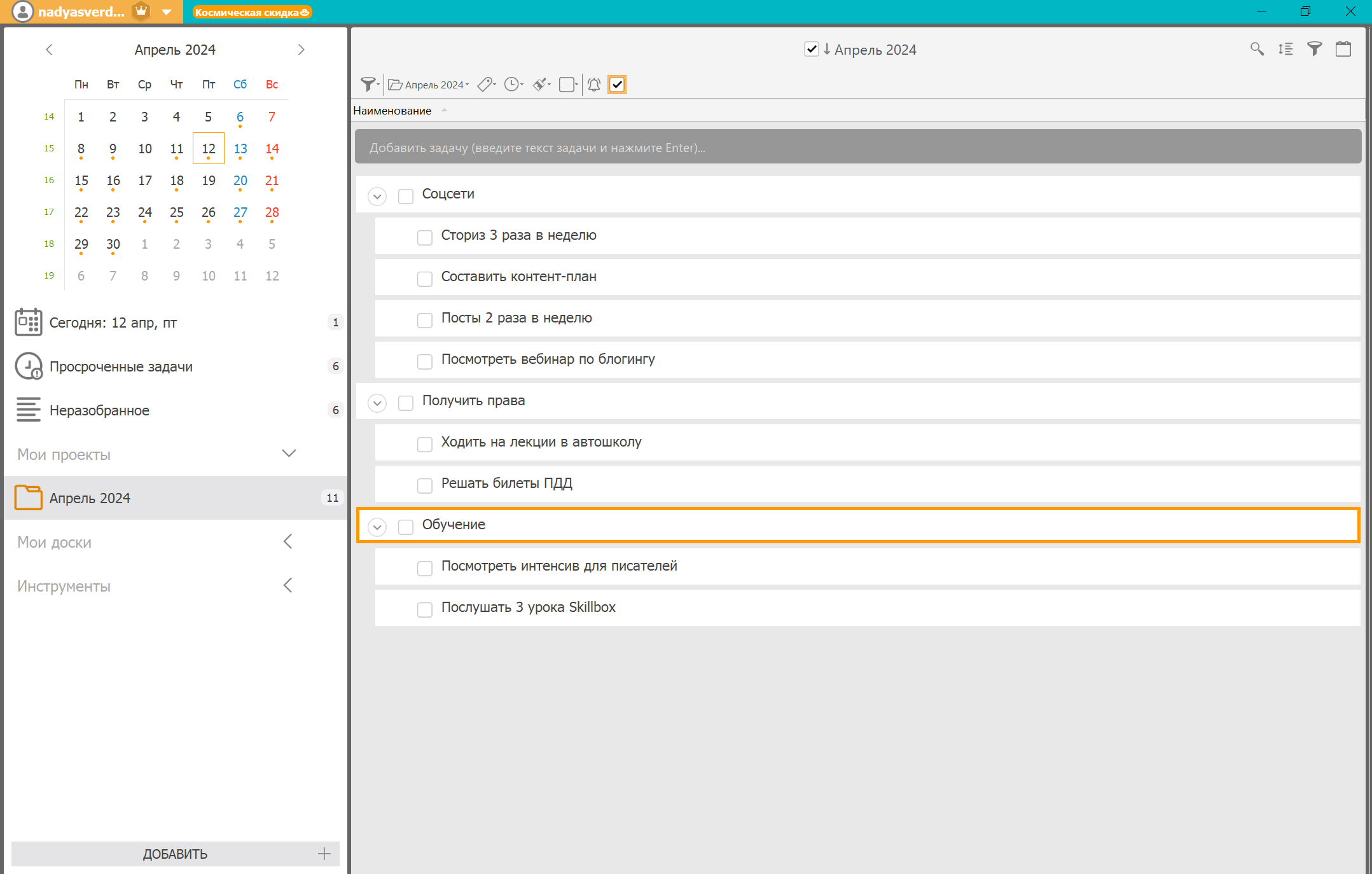 У меня заканчивается доступ к материалам интенсива для писателей, поэтому нужно обязательно пройти его в апреле. Заодно решила прослушать несколько уроков из курса Skillbox. Так я работаю сразу над несколькими годовыми целями.