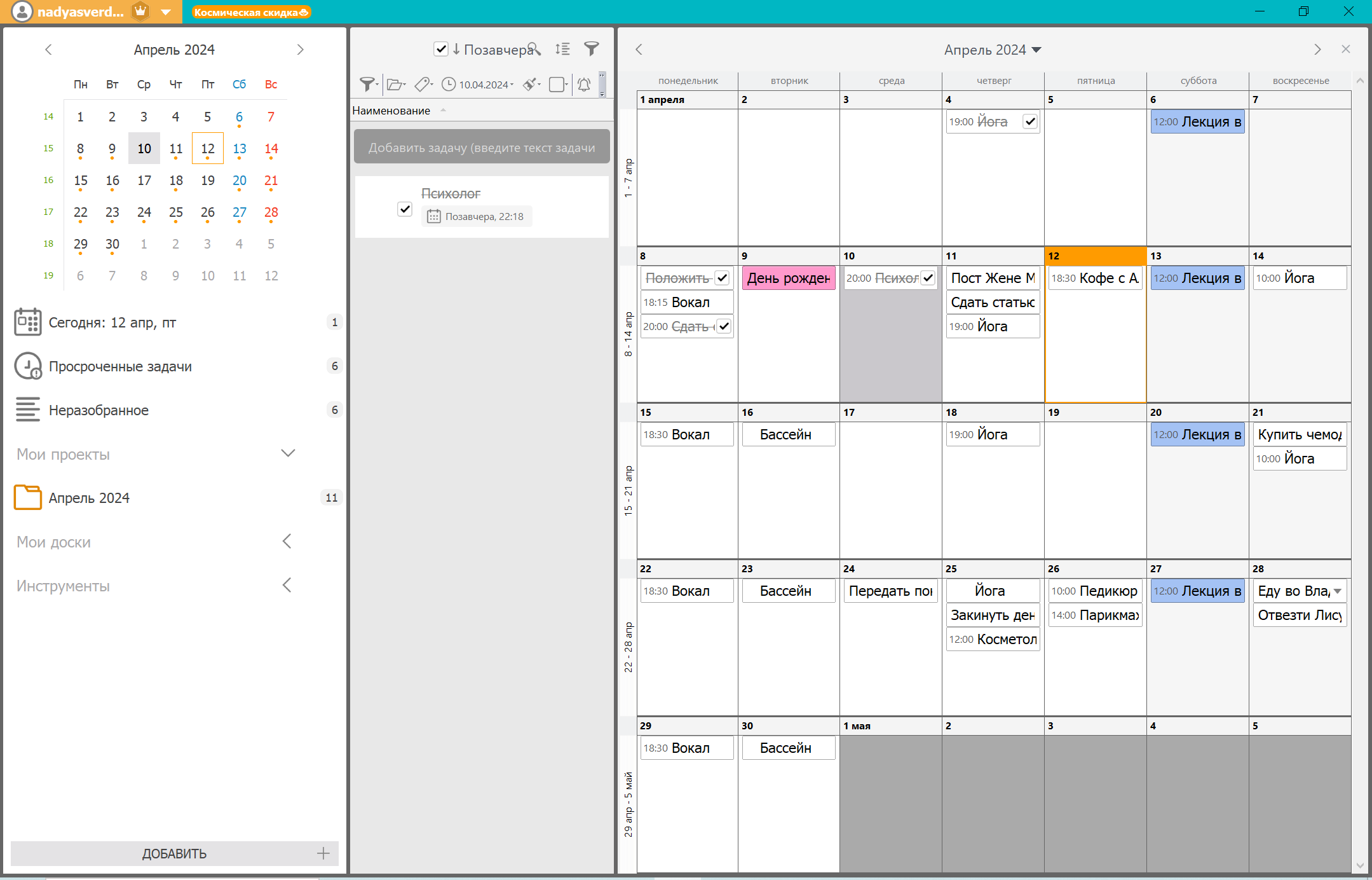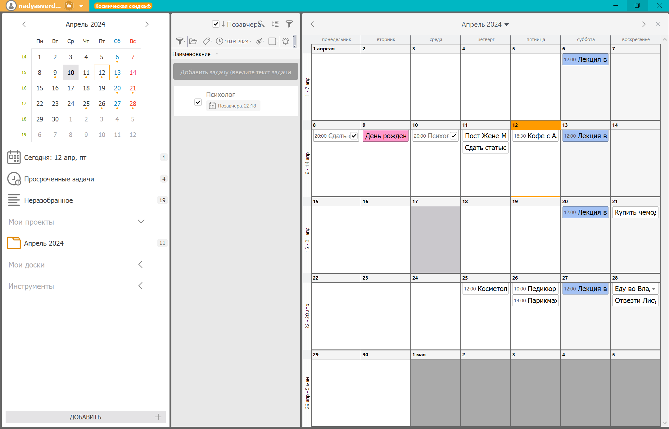 Я всегда начинаю с того, что фиксирую в календаре дела и встречи, у которых есть четкие сроки. Это могут быть рабочие задачи, например, сдача текста заказчику, сессия с психологом или бьюти-процедуры.