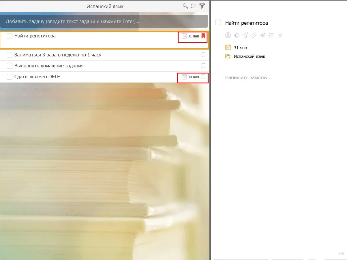 После создания списка дел важно назначить для каждого пункта срок выполнения и приоритет. Это поможет сфокусироваться на главном и не упустить важные дедлайны. Например, для задачи «Найти репетитора» установим высокий приоритет и срок — 31 января. А для «Сдать экзамен DELE» — самый поздний срок, 30 ноября.