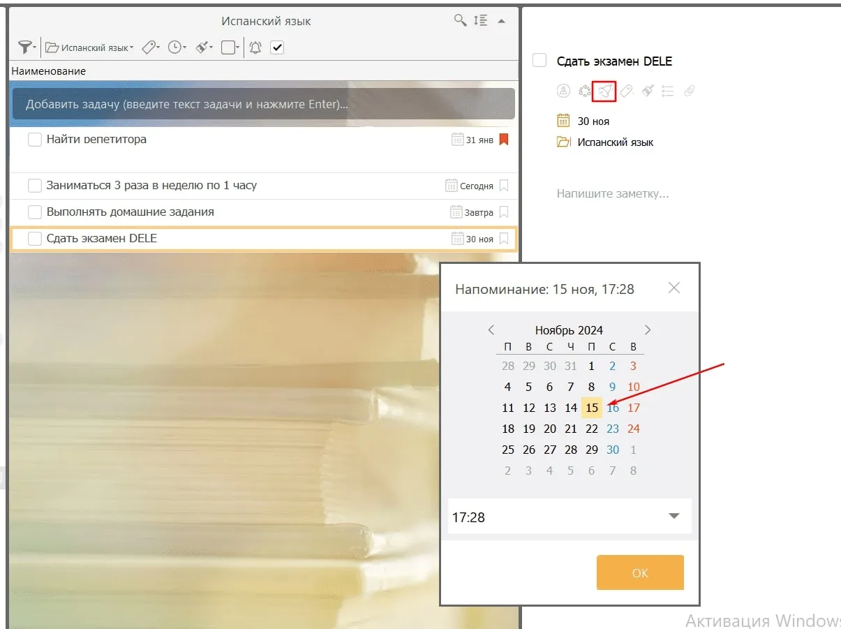Установите напоминания для важных событий, чтобы не пропустить их. Например, за 2 недели до экзамена DELE можно поставить напоминание об интенсивной подготовке, а чтобы не забывать взвешиваться, можно установить ежедневное напоминание на 7 утра.