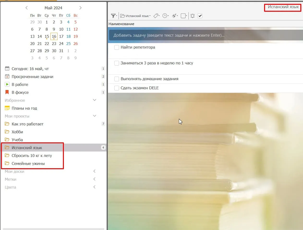 За пример возьмем цели, с которыми мы уже работали: испанский язык, сбросить 10 кг к лету и еженедельные семейные ужины. Для каждой цели нужно создать проект и внутри расписать задачи, которые мы обозначили выше.
