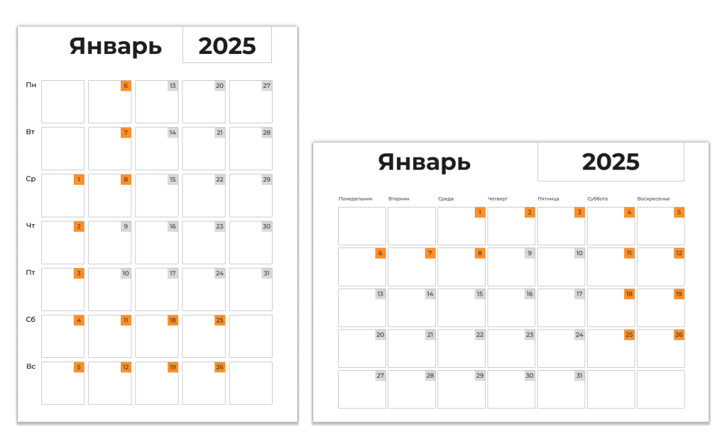 Шаблон календаря на Январь 2025