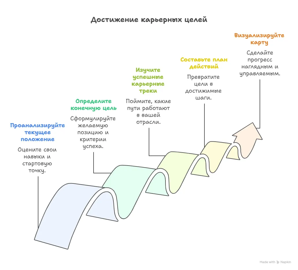 Если вы ищете пример карты карьерного роста, начните с простого: зафиксируйте текущий уровень, цели на 3–5 лет и основные компетенции вашей профессии.