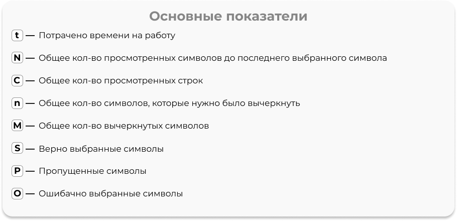 Во время анализа результатов эксперимента, исследователь определяет количество колец, которые испытуемый успел просмотреть за отведенное время. Кроме того, он также определяет количество ошибок, совершенных им в процессе выполнения задания. Основные показатели необходимые для рассчета результата тестирования: