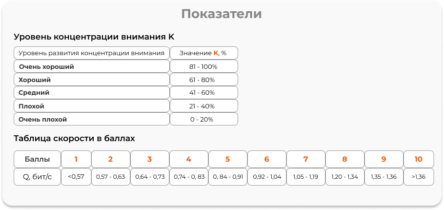 Уровень концентрации внимания и скорости определяется по следующим данным: