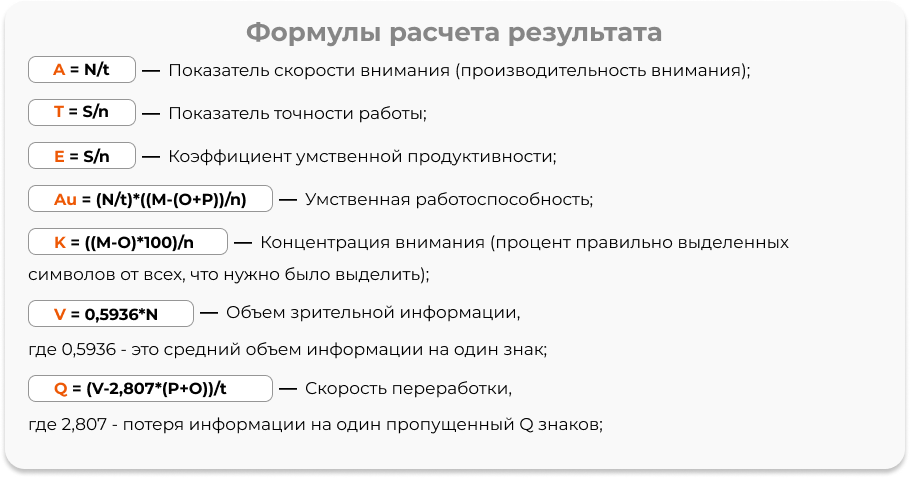 Чтобы понять, насколько продуктивно, устойчиво внимание, а также определить его объем, используется следующие показатели и формулы: