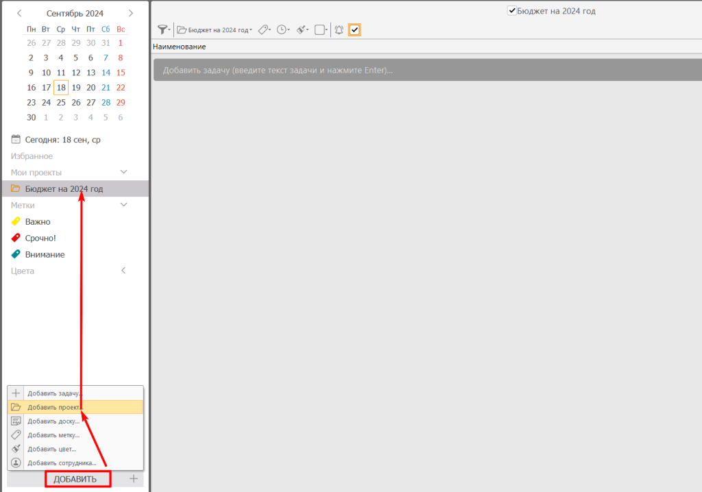 - Создайте новый проект, назовите его «Бюджет на 2024 год» или любым другим именем, которое будет отражать текущий период планирования.