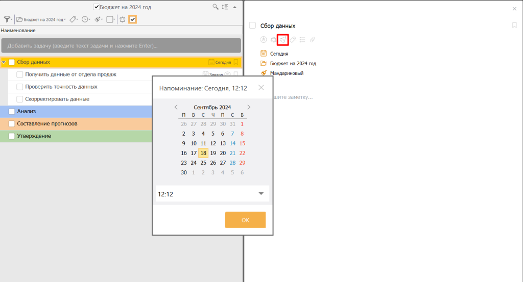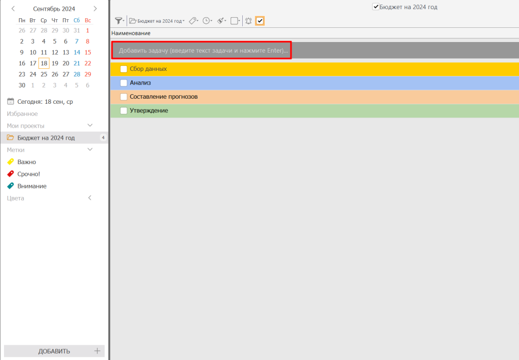 - Создайте задачи для каждого этапа бюджетного цикла: сбор данных, анализ, составление прогнозов, утверждение. Введите этапы в специальное поле.