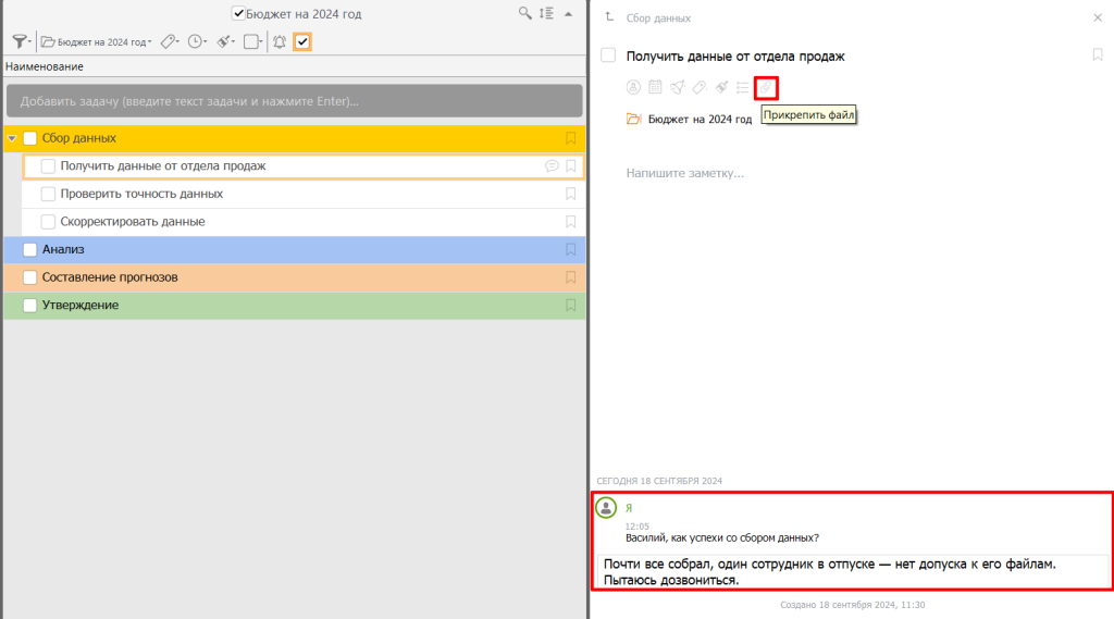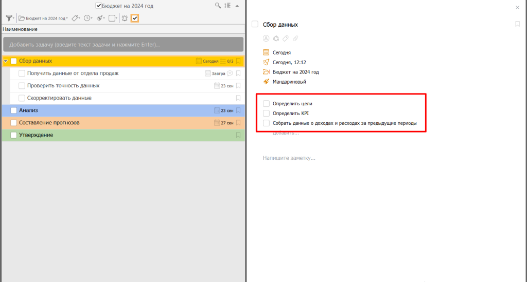 Чек-листы в таск-менеджере помогают сделать процессы бюджетного планирования более стандартными. Можете создавать шаблоны чек-листов для различных этапов и использовать их для контроля выполнения дел. Это обеспечивает единообразие и упрощает контроль за выполнением всех необходимых действий.