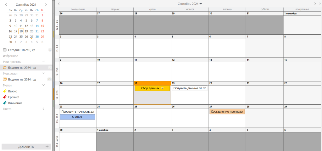 - Используйте календарь как ежедневник. Все задачи с прикрепленными датами сразу же отображаются в нем. Также в календаре отмечайте все важные даты, связанные с бюджетным планированием: дедлайны, совещания, отчетные периоды.