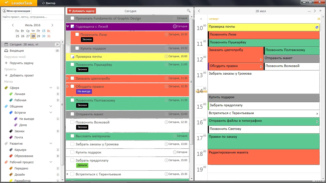 Зачастую фрилансер осваивает и развивает несколько смежных профессий, постоянно получая дополнительные навыки и знания для того, чтобы успешно конкурировать на рынке труда. Учитывая, что в процессе работы ему необходимо выполнять далеко не одну функцию, наибольший позитивный эффект от планирования рабочего времени будет получен при организации своих дел по определённым контекстным меткам, таким как действие, место или сфера деятельности. Для этих целей в органайзере LeaderTask заложена возможность создания меток для задач. Использование этой возможности позволит фрилансеру быстро ориентироваться в полном списке задач и группировать их по персональным критериям, возможно, присущим только его специфике деятельности.