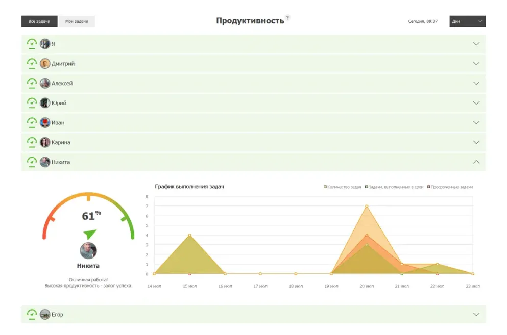 С помощью статусов и графиков продуктивности можно отслеживать, как ведется работа. Это дает возможность выявить узкие места и понять, какие задания требуют больше внимания.