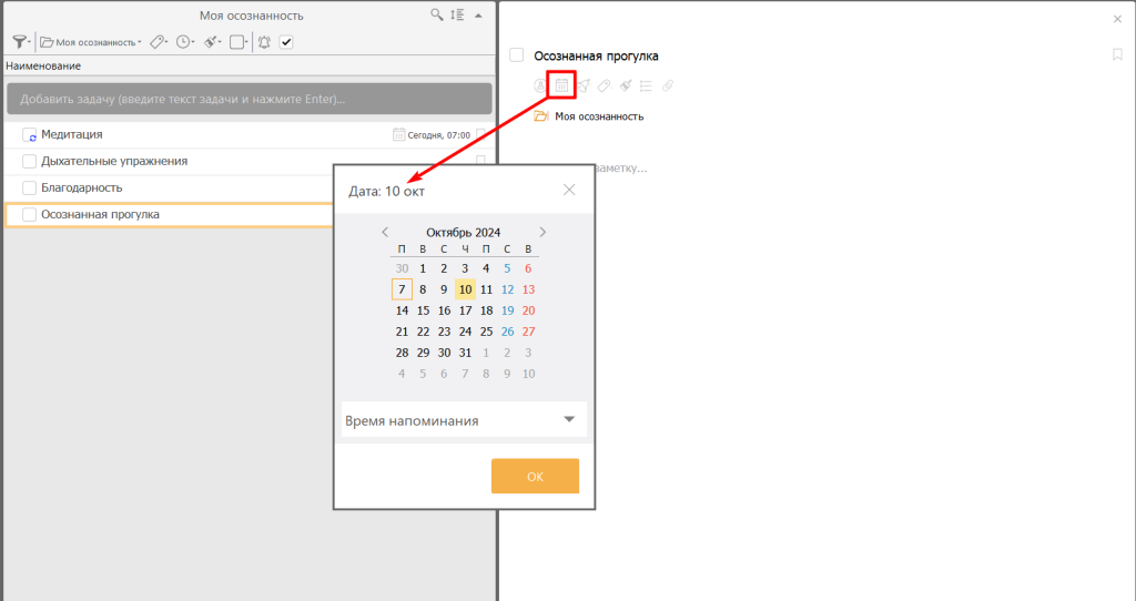 Структура и организация: таск-менеджер помогает структурировать практику, создавать четкий план действий. Можно распределить время для медитации, дыхательных упражнений и других действий, и отслеживать прогресс.