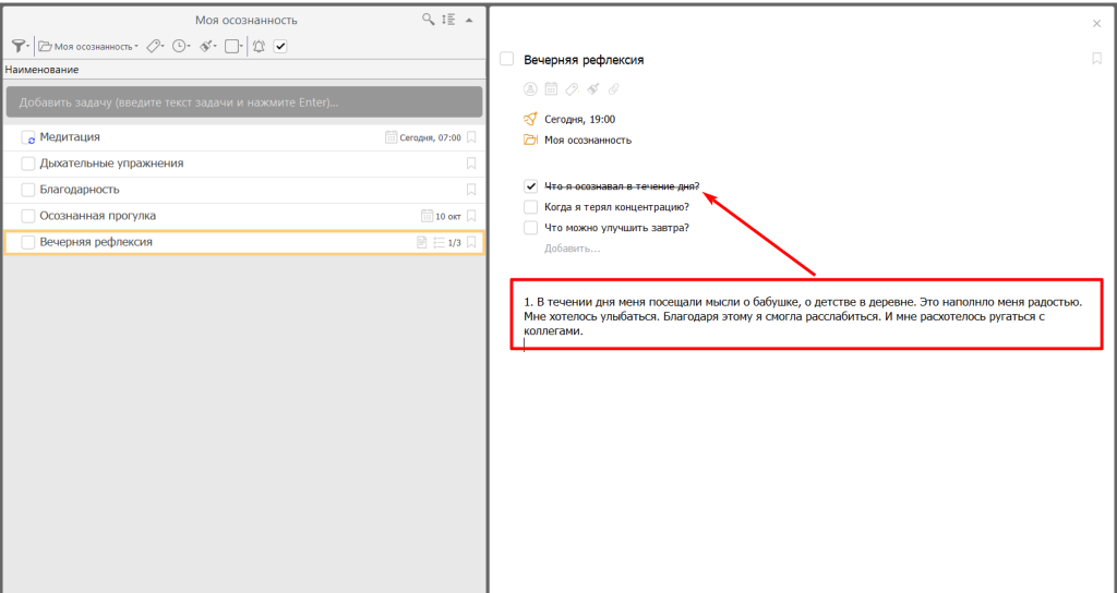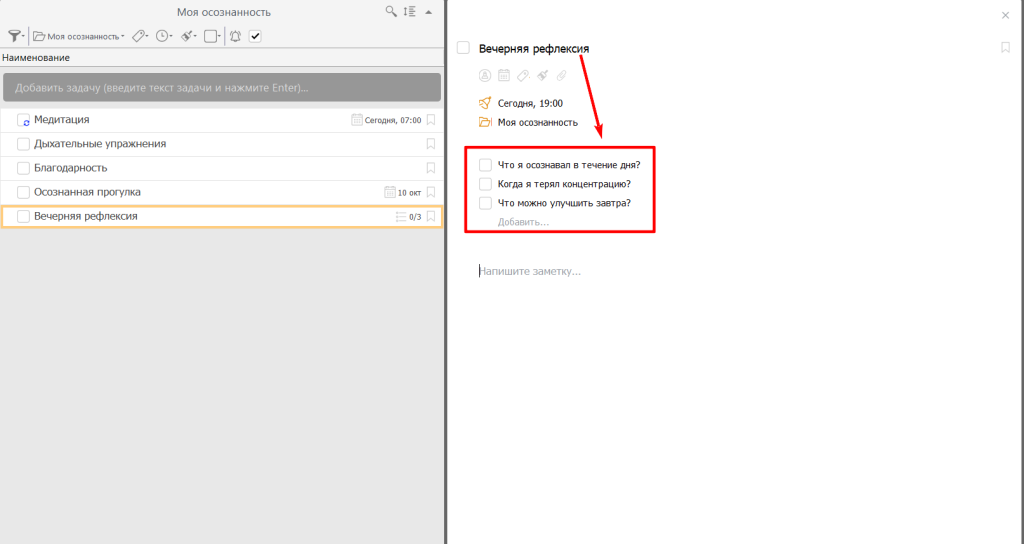 Добавьте чек-лист с вопросами, например, «Что я осознавал в течение дня?», «Когда я терял концентрацию?», «Что можно улучшить завтра?».