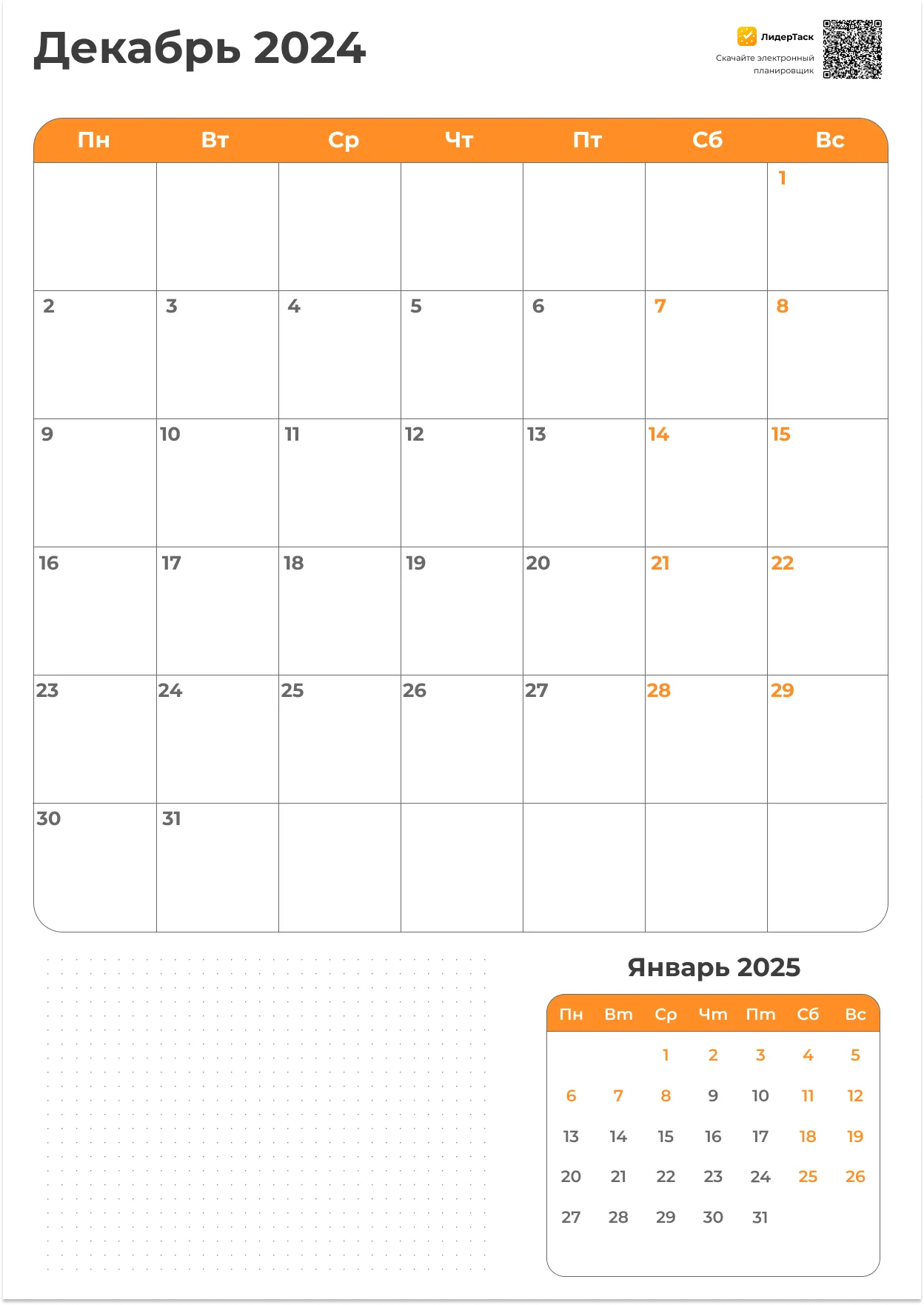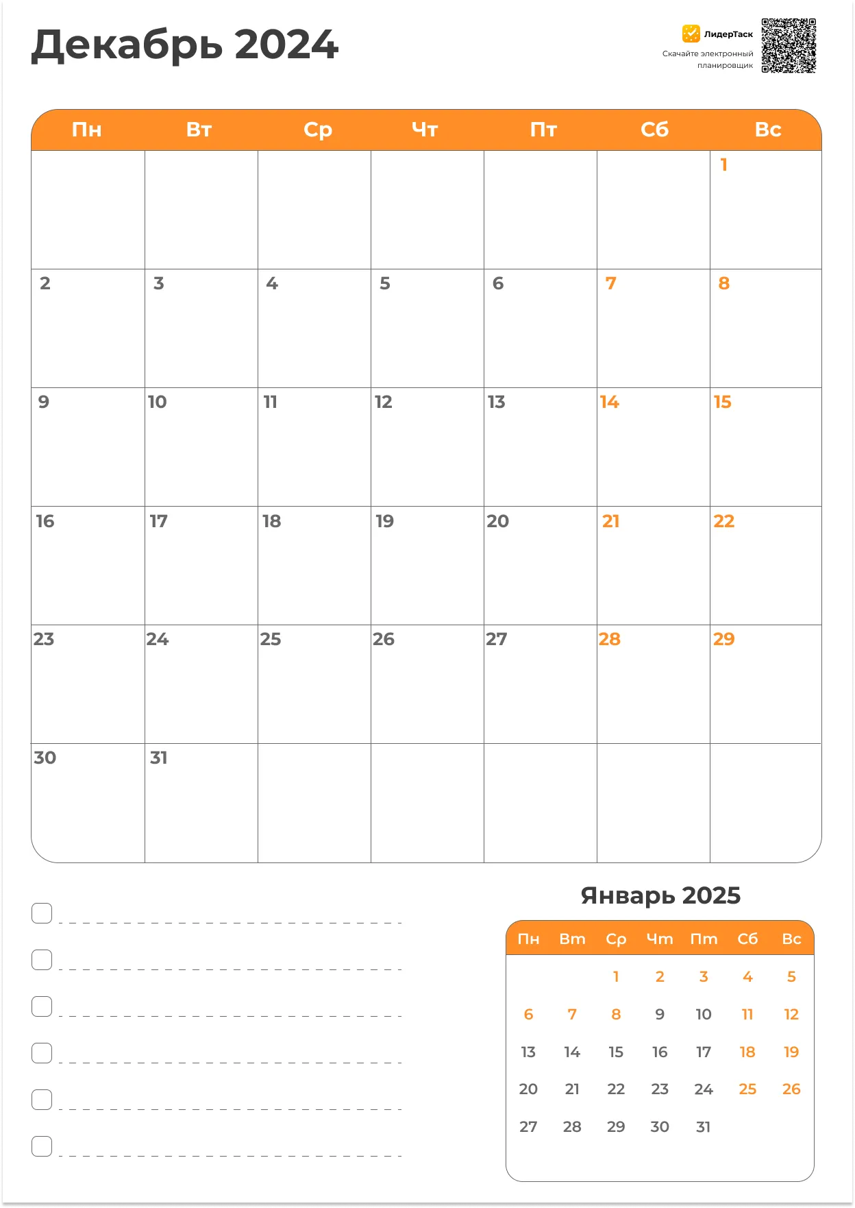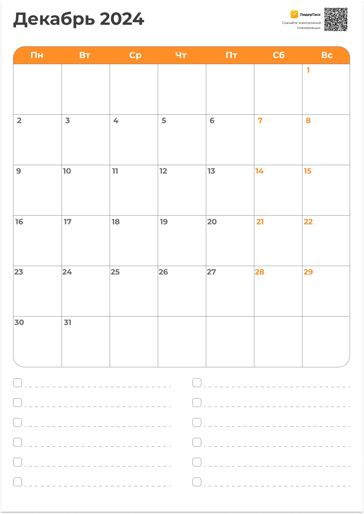 Вертикальный шаблон на Декабрь 2024 с полями для записи важных задач и целей на месяц.