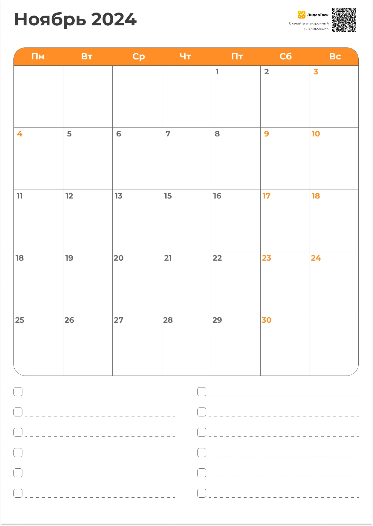 Вертикальный шаблон на Ноябрь 2024 с полями для записи важных задач и целей на месяц.