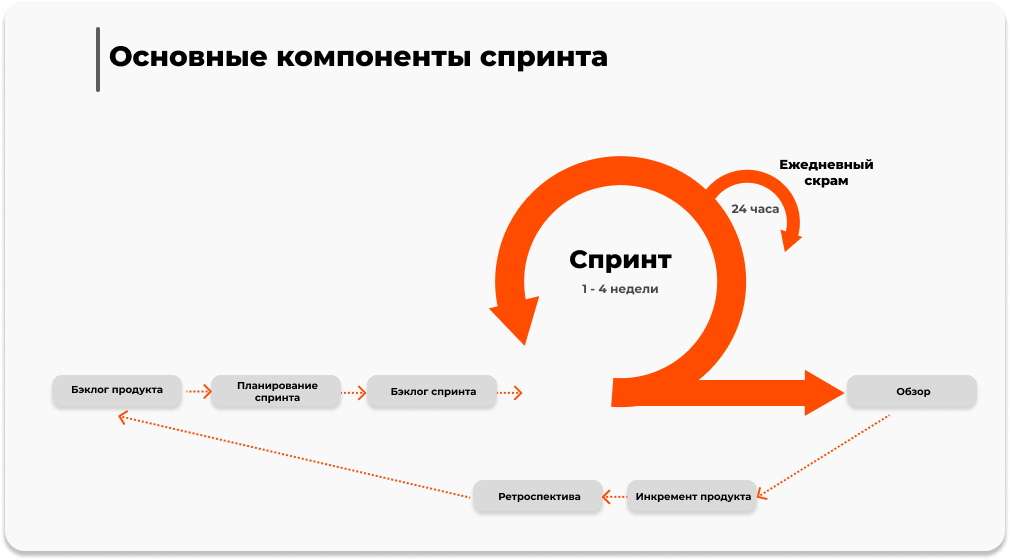Затем следует ретроспектива, на которой команда анализирует прошедший цикл разработки и определяет возможности для улучшений. Таким образом, спринт представляет собой единый замкнутый цикл разработки, инспекции и адаптации. Работа по коротким временным промежуткам позволяет своевременно реагировать на изменения и постоянно совершенствовать рабочие процессы.
