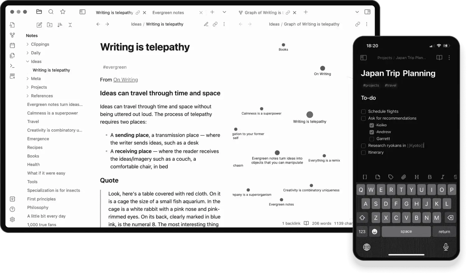 Obsidian — двусторонние ссылки, граф знаний, плагины, локальное хранение.