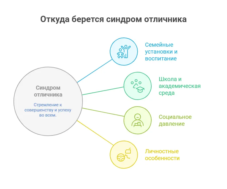 Синдром отличника не возникает внезапно. Он формируется постепенно под влиянием воспитания, школьной системы, социальной среды и связан с личностными особенностями. Эти факторы задают установки, которые во взрослом возрасте превращаются в устойчивое стремление соответствовать завышенным ожиданиям и бояться ошибок.