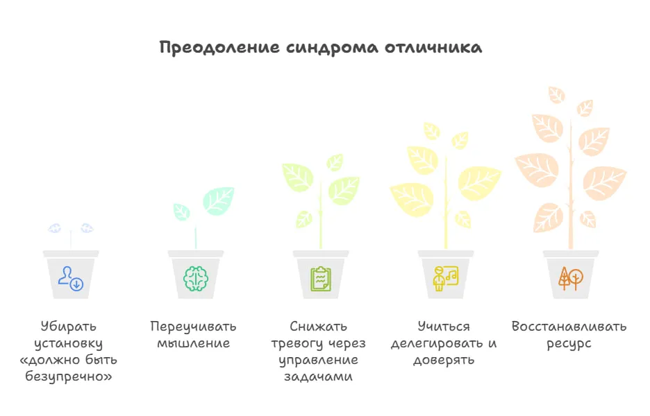 Синдром отличника — устойчивая стратегия поведения, которую можно постепенно заменить более здоровыми привычками. Чтобы справиться с ним, важно не «перестать стараться», а научиться работать реалистично, мягче относиться к ошибкам и снижать внутреннее давление.