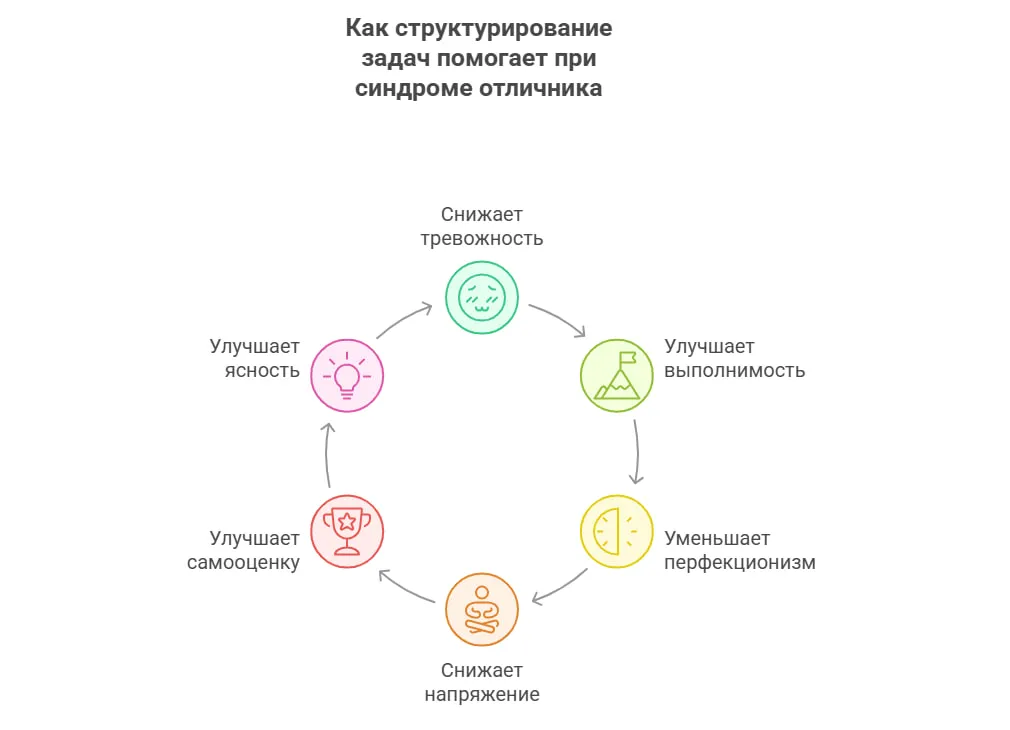 Структурирование задач — один из самых простых и при этом самых эффективных способов снизить проявления синдрома отличника. Когда дела разложены по полочкам, у человека уменьшается тревога, появляется ощущение управляемости, а стремление «делать идеально» перестаёт брать верх над здравым смыслом.
